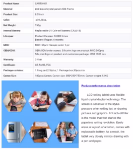 The 8.5-Inch LCD Writing Tablet is a fun, eco-friendly tool for kids to write, draw, and learn. Featuring a one-key delete function, touch screen writing, and durable LCD + ABS design, it’s perfect for endless creativity without the mess. Lightweight and easy to carry—ideal for home, school, or travel.