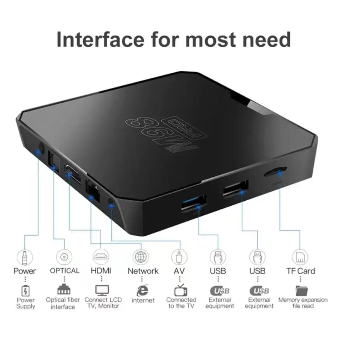 The M98 Pro Smart TV Box transforms any standard television into a powerful Android-based entertainment center. Powered by Android 12 and equipped with the H313 chipset, it supports both 2.4G and 5G dual-band WiFi for faster and more stable connections. Enjoy ultra-smooth 4K streaming, gaming, and app usage with enhanced performance and compatibility.